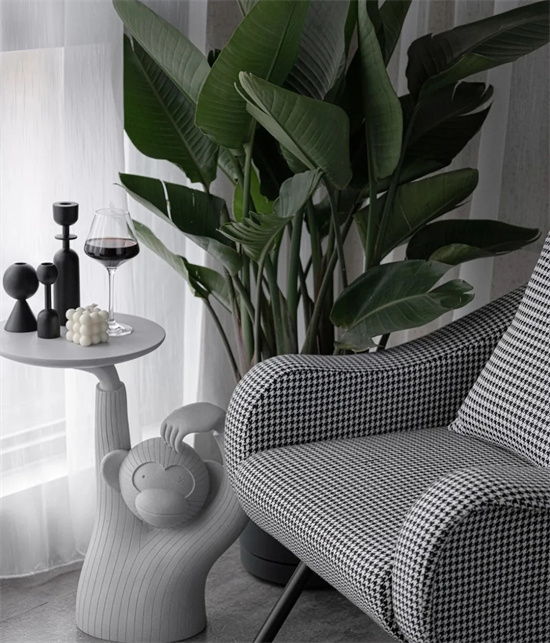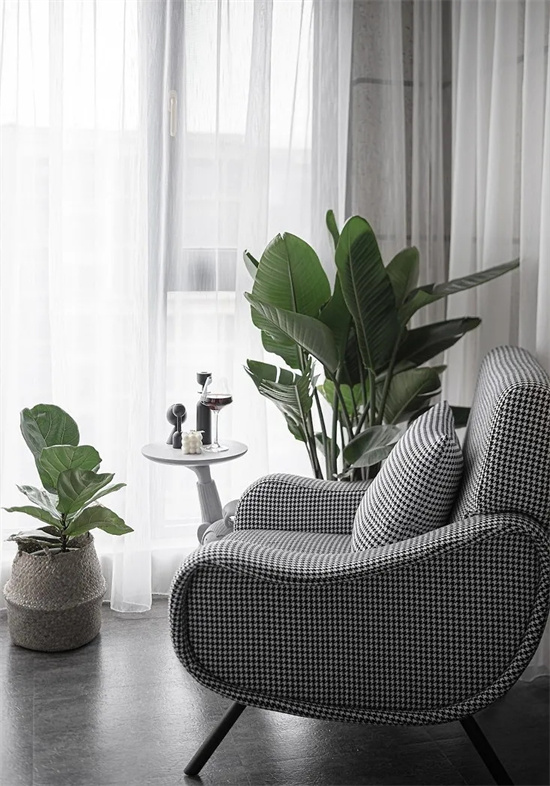 在重色的家居软装搭配中加入千鸟格,布艺单椅浅色的视觉可以轻易跳出来。