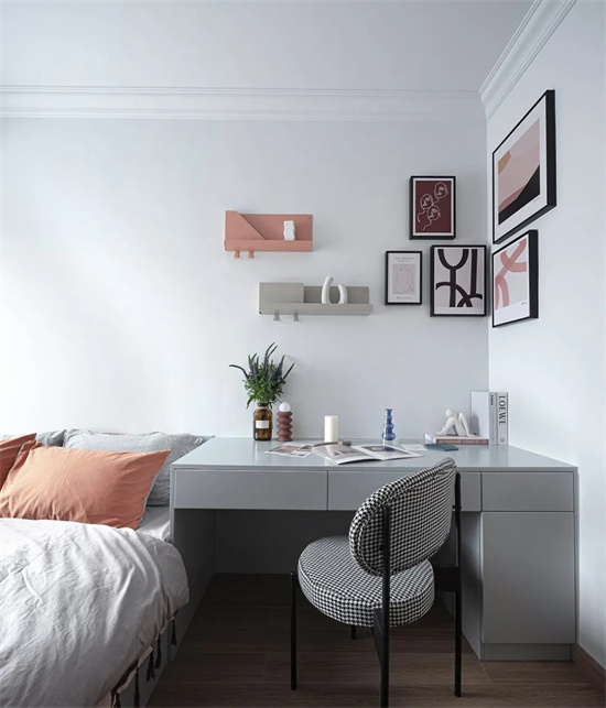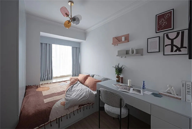 榻榻米与书桌、衣柜的整体定制无缝连接,每一寸可利用空间也让整个空间更加统一、协调。