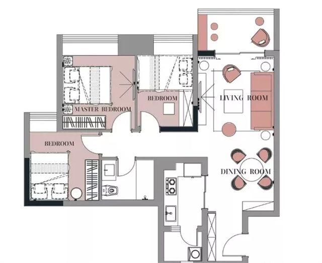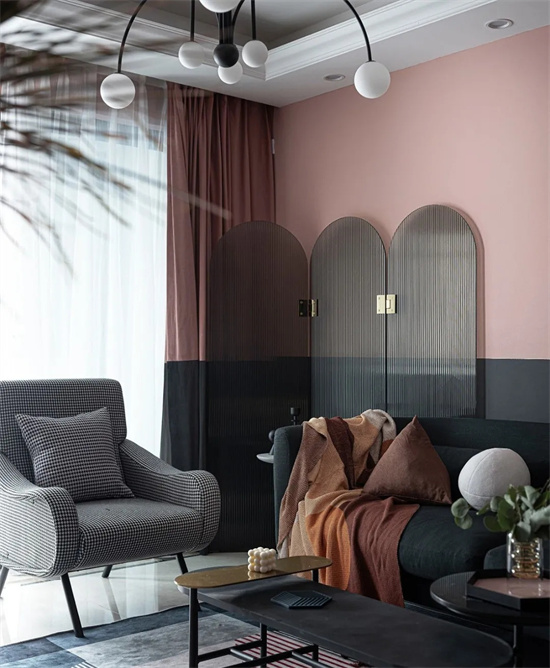 灰粉色和黑色上下拼色的设计,同样运用在了窗帘上整个空间的拼色完全是一个统一的效果。