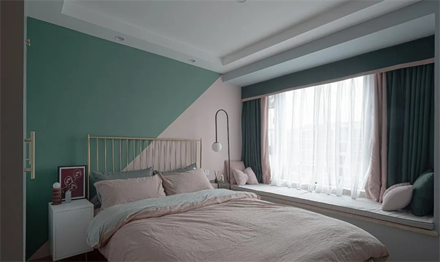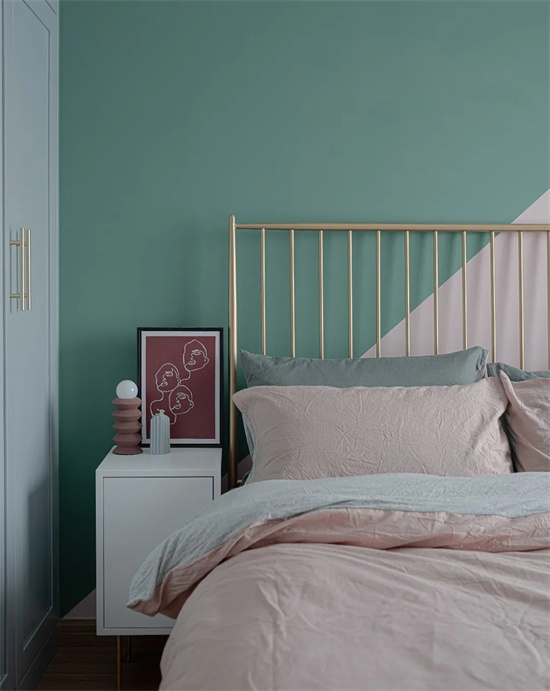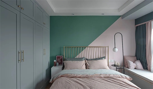 主卧采用粉色和绿色为墙面分色,这样让狭小的卧室视觉空间感不会被压缩。