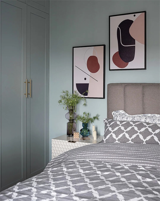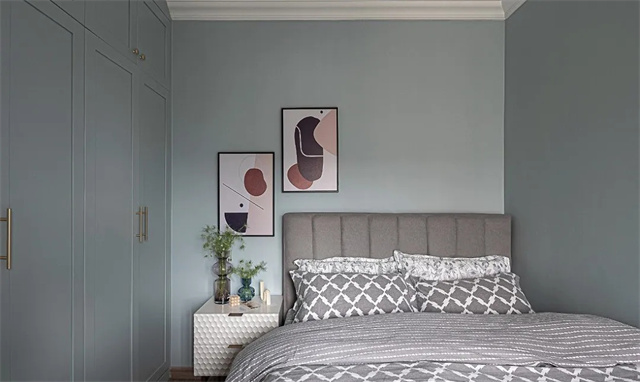 因为主卧的背景墙面,也采用了分色处理,所以同样没有再采用挂画的设计,而是把装饰画摆放在了床头柜上。