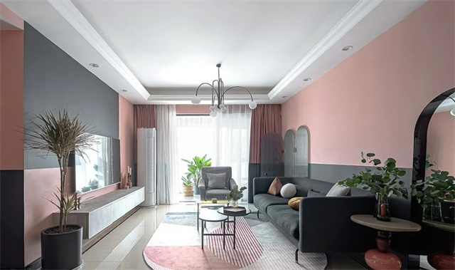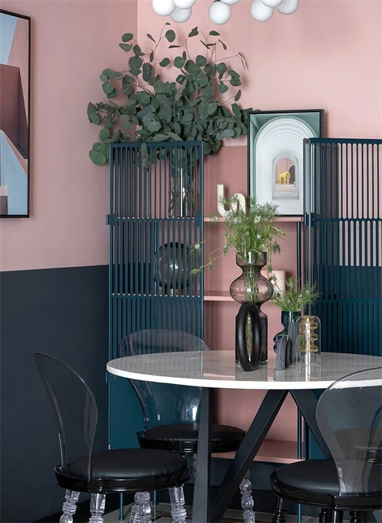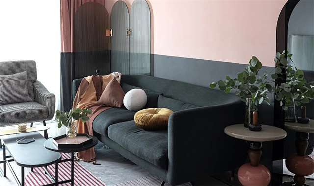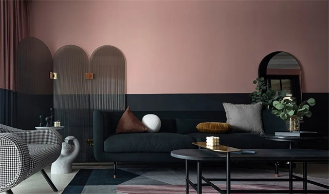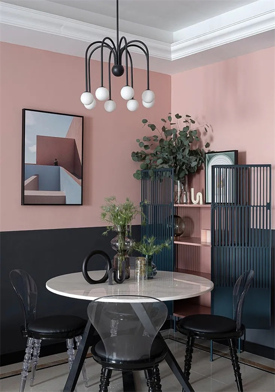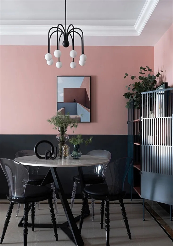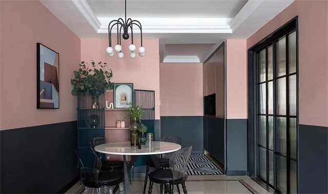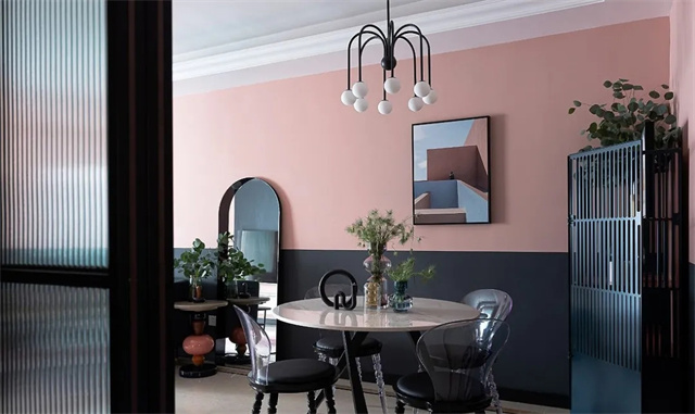 全屋用灰粉色和黑色墙漆上下拼色的方式来营造复古感,通过大面积的色彩来带动视觉冲击力。