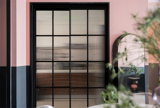厨房选择了黑色细框的长虹玻璃推拉门增加视觉层次感,既能保证空间光线的通透,又能适当的遮挡厨房空间的凌乱。