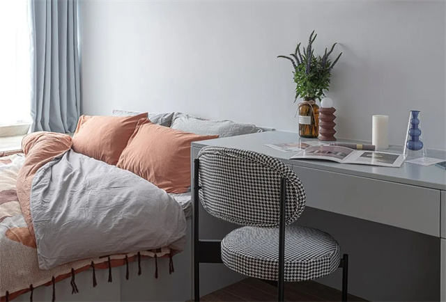 浅灰调安静而柔和,搭配饱和度低视觉感受柔和的莫兰迪色调细节软装,给人以极温柔的精神慰藉。
