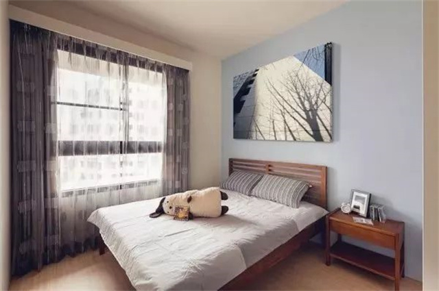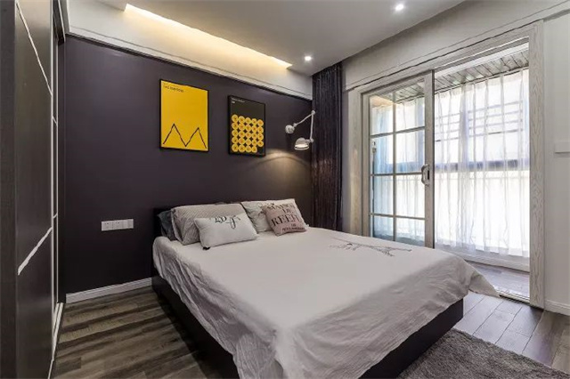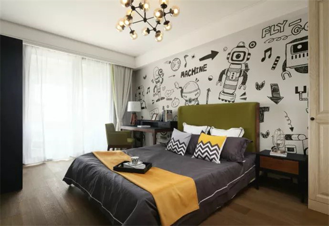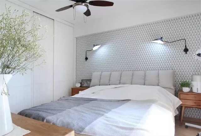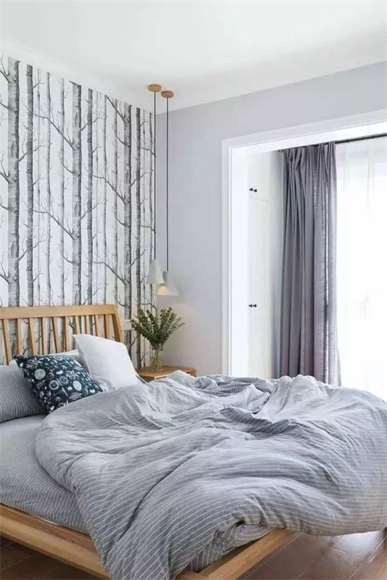 北欧风格卧室特征:简约、颜色以黑白灰为主,整体追求线条的简约、经常运用原木元素和不规则几何元素。选择背景墙时要符合北欧风格的特征。