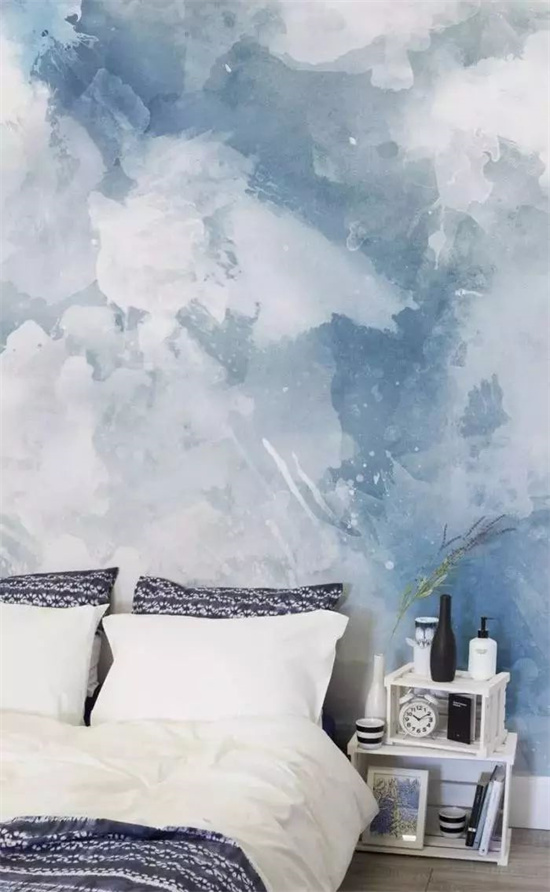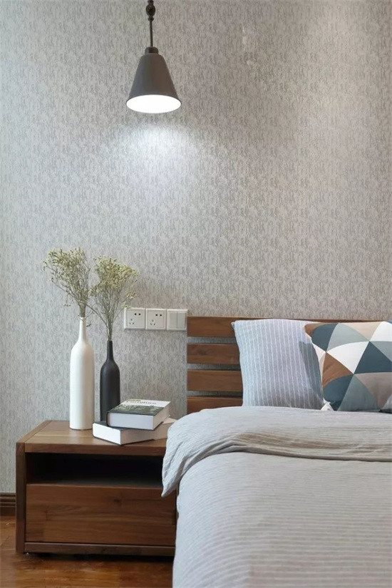 壁纸施工简单,成本不高,而且装饰效果好,选择多样,是卧室床头背景墙装饰常用的又一种材质。在挑选时,要根据整体风格的色调,要有一致感。