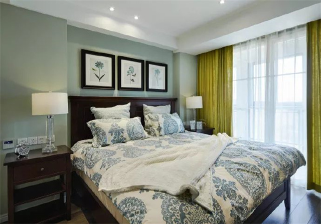 彩色墙漆+挂画的床头背景墙装饰是稍显清新气息的美式床头背景墙选择。通常会选择各种清新的颜色。