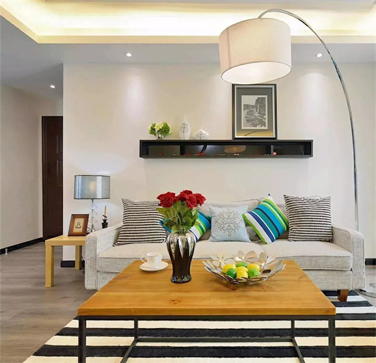 在沙发背景墙上简单装一个置物架,置物架的上方摆放了绿植和装饰画,中间还可以放一些零碎杂物、手办等。中山帮忙装修网公司分享。