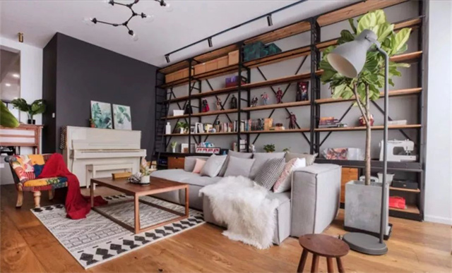 这样开放式的书架在工业风中比较常见,铁艺和原木结合起来,非常有格调,唯一的缺点就是比较难清洁,容易积灰,太高的地方基本就是卫生死角了。