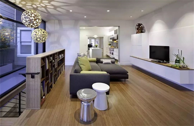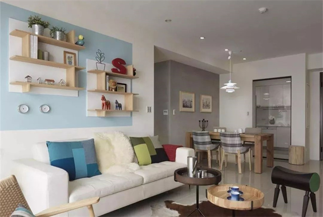 或者把背景墙给舍弃了,改成开放式的设计,沙发背后留下一条走道,再做个矮书柜当隔断,或者是做一个吧台,开放式的设计很适合小户型,更显宽敞。