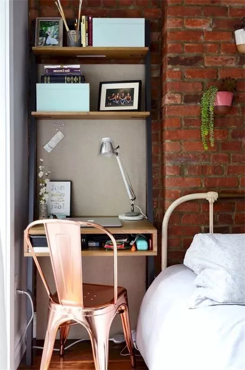 还可以把书桌放在床的对面,做个转角书架,面积虽小但很惬意。