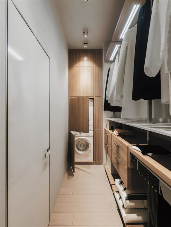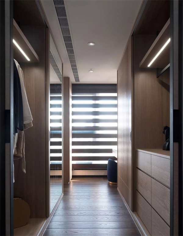 最常见的是,衣帽间与卫生间共用同一个入口,早晨起来从卧室到衣帽间换衣服再到卫生间洗漱,一气呵成。