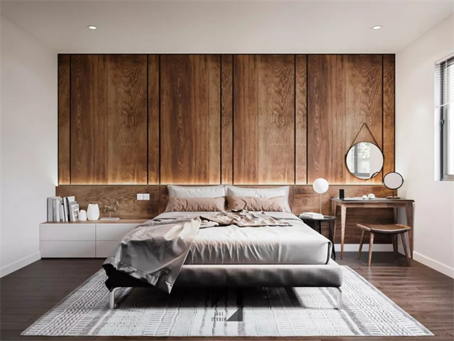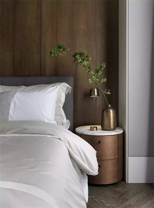 在家居设计中常说的一句话是:“木对木,皮对皮。”不论床头柜选择怎样的方式,与床、床头、背景墙、衣柜、卧室壁纸地面,甚至是灯光、自然光等等,从色彩,到造型线条,再到材料质感,彼此都应该有所呼应对照,可以更加美观。