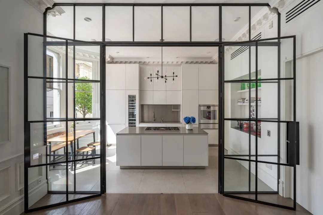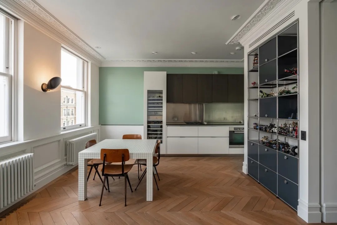 一楼的开放式起居空间,书房和厨房被 Crittall 玻璃墙隔开,巧妙地穿过华丽的格鲁吉亚天花板飞檐,突出了对细节的关注。暗框玻璃隔断不仅增强了自然光并保护了视线,而且还在视觉上扩大了居住者的“阅读”面积。