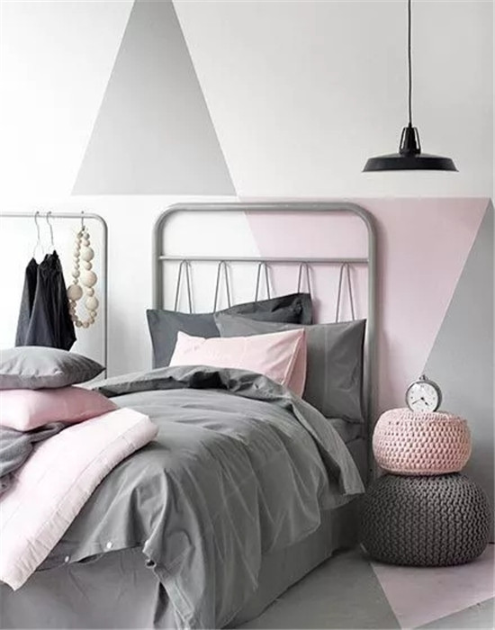简单的铁艺床,铺上灰色床品,搭配粉色抱枕,与墙面地面相得益彰,空间不经意流露出简单和谐之美,用两个编织的叠加圆凳作为床头柜,更是别出心裁。