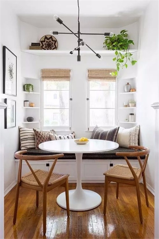 不少户型因为空间受限,餐厅位置被压缩,只能挤在小角落里面。与其这样,不如将窗边改造成卡座餐厅,就着阳光和夜景吃晚餐,最浪漫不过了。